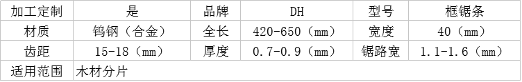 框鋸條根據(jù)鋸機型號、待加工木材尺寸、木材干濕度、木材軟硬度、木材紋理結(jié)構(gòu),選用合適的鋸條,包括合金硬度、齒距、齒形、齒寬、機體厚度和切削角度等。良好的應(yīng)力處理技術(shù),保證了鋸條在高速運轉(zhuǎn)過程中不易疲勞變形,廣泛適用于各種軟硬木材、竹材的鋸切。